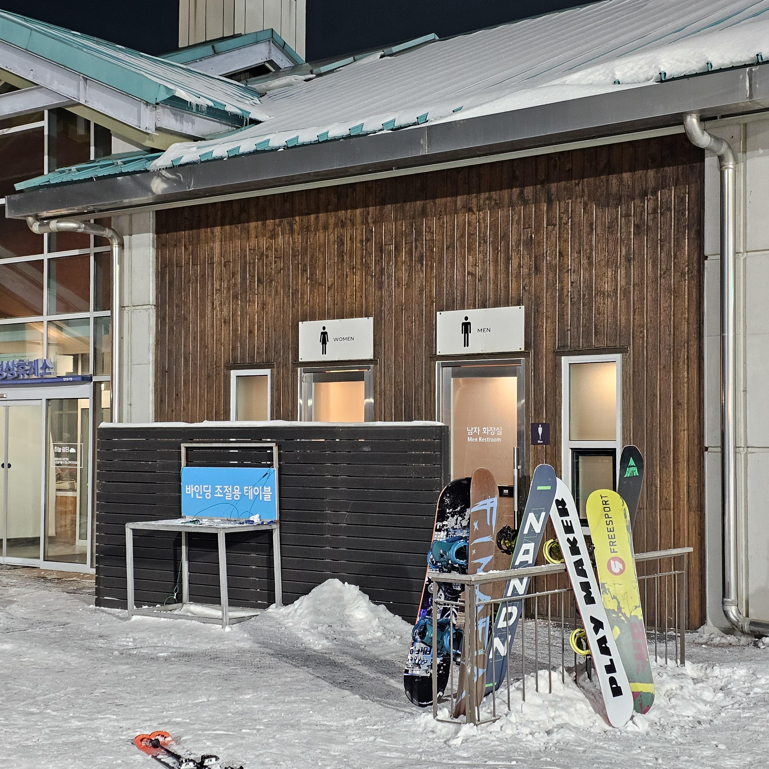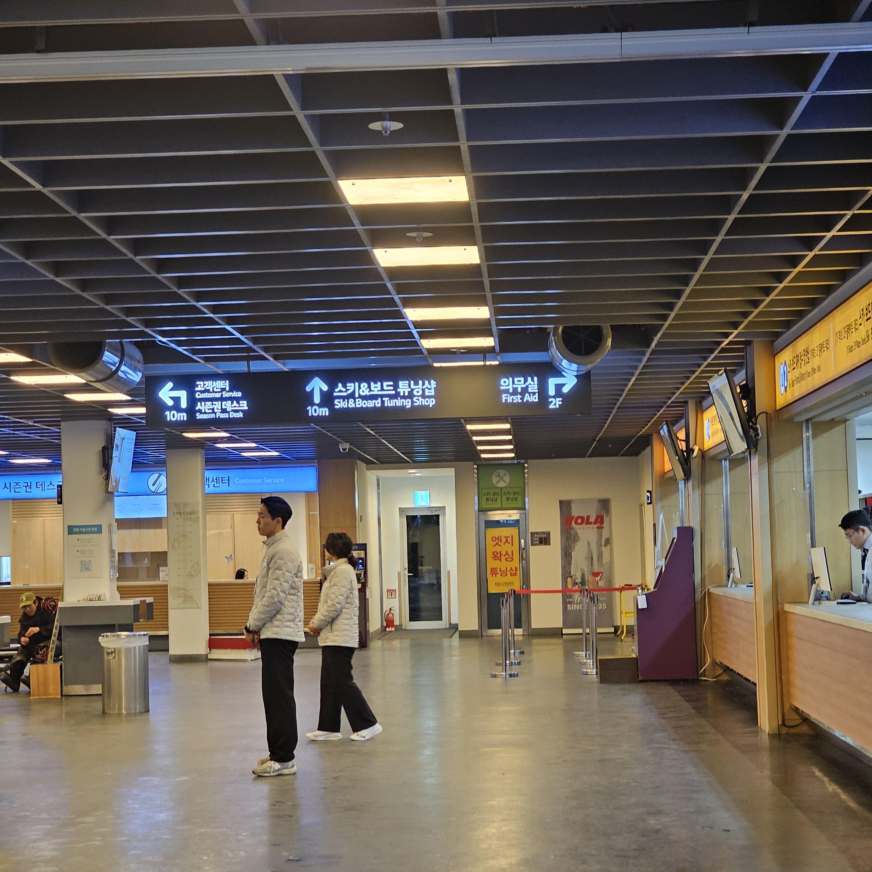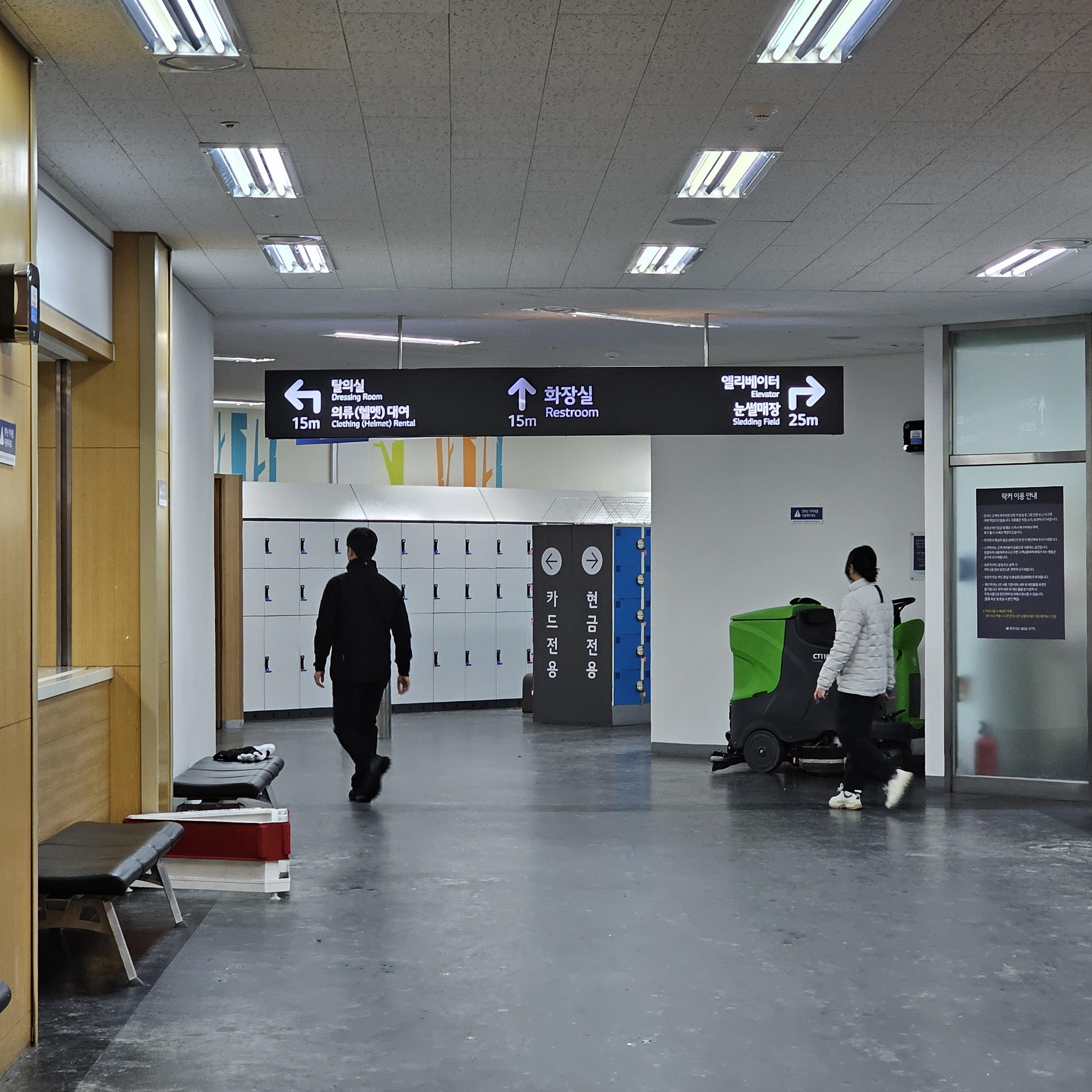 1층에는 락커룸, 화장실, 고객센터/장비 수리실, 스키/보드 대여 접수처가 있습니다!