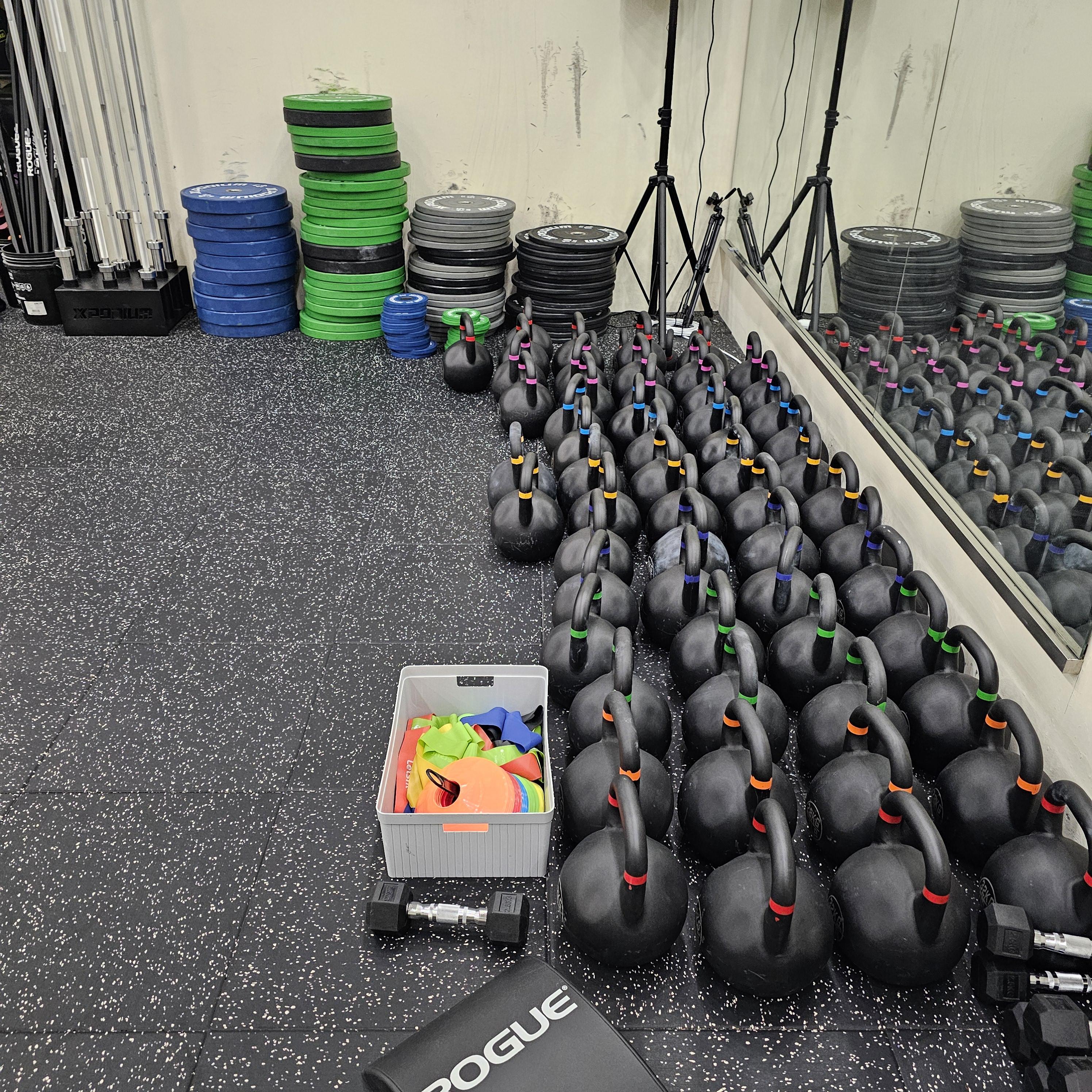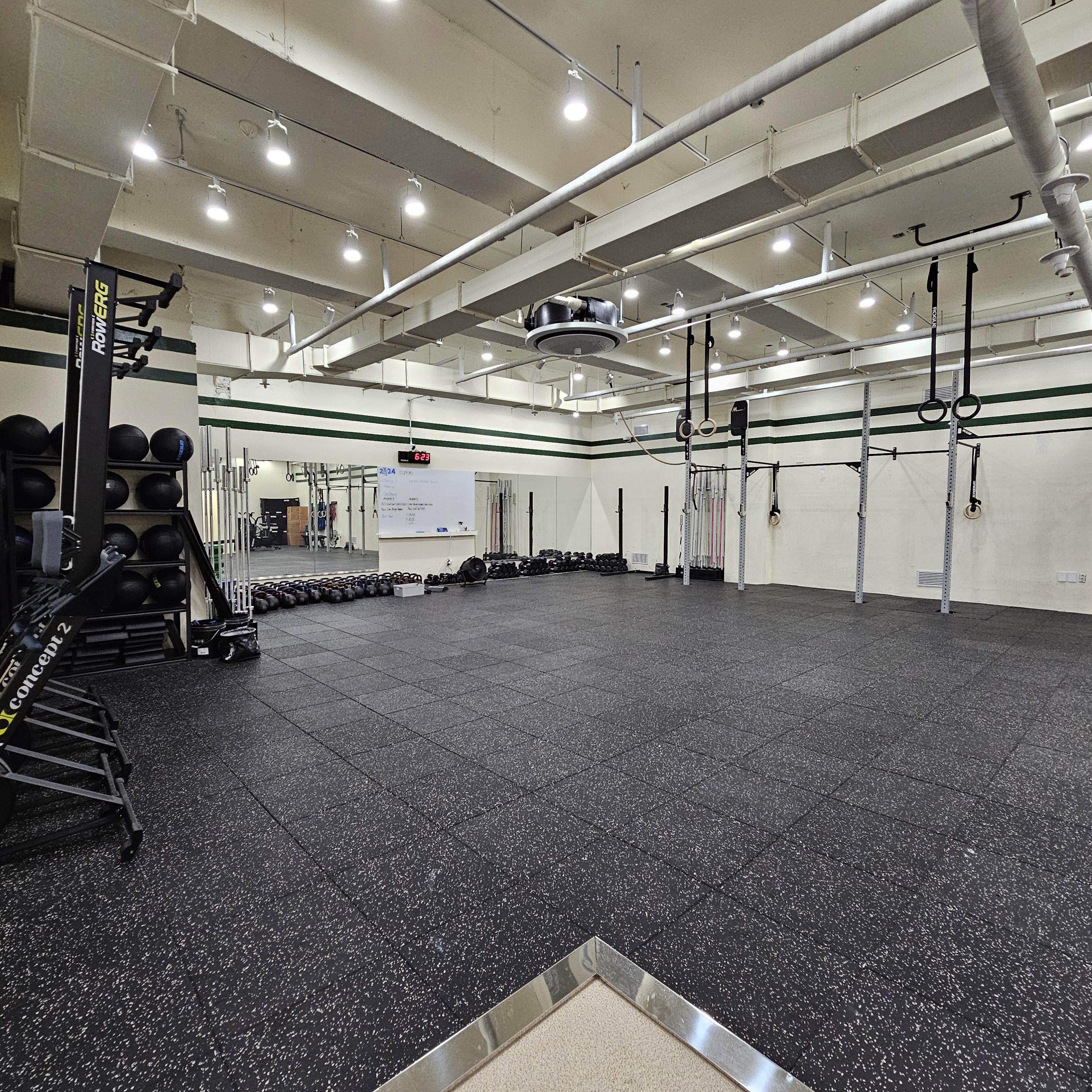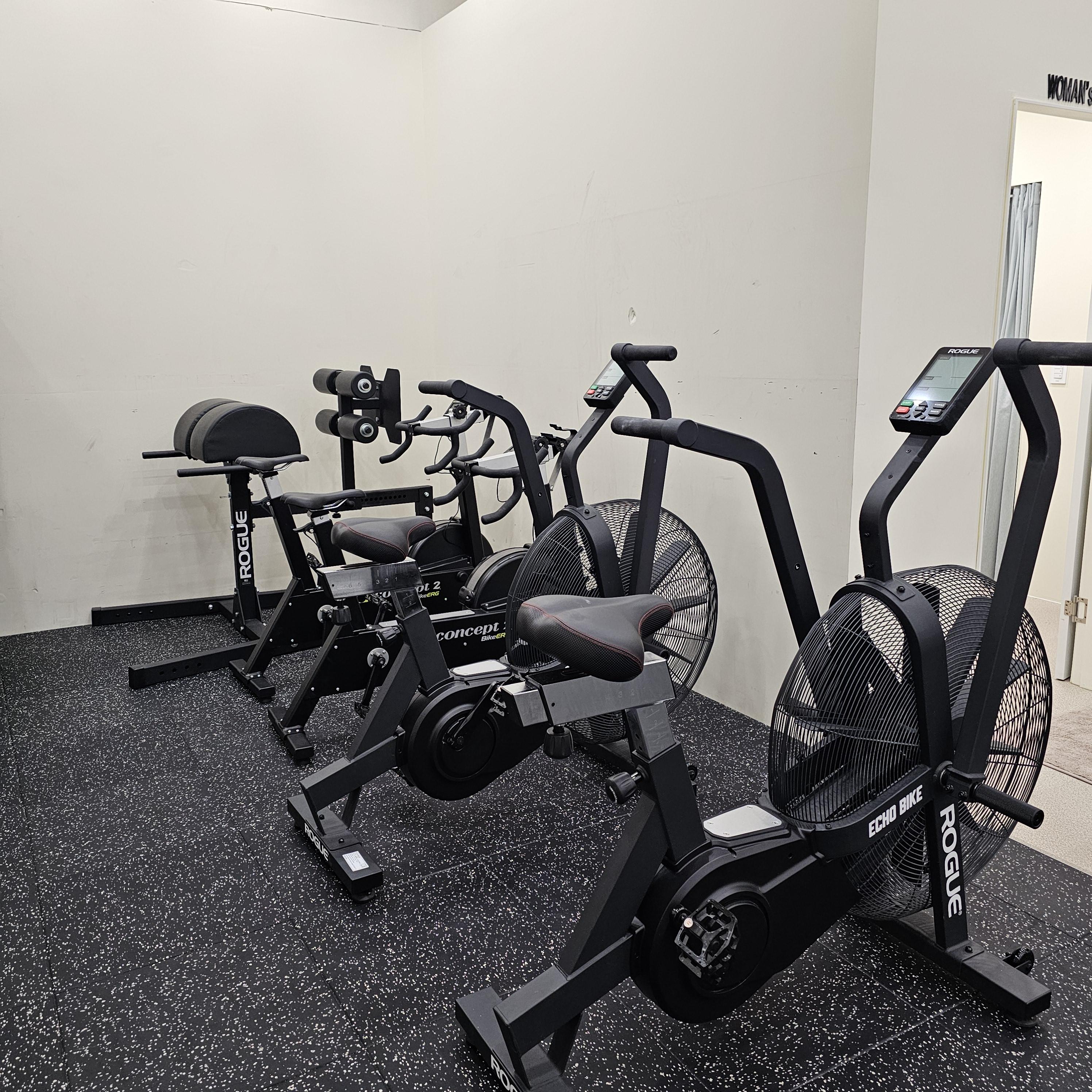 각종 크로스핏장비와 덤벨, 바벨, 밴딩, 줄넘기 등 구비되어 있는 공간이고, 로잉과 어썰트 바이크도 보이네요!